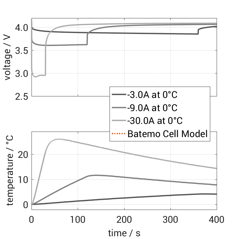 Moreover, the Batemo Cell Model validation will be fully transparent. The Batemo Cell Data contains the raw measurement and simulation data. For all experiments the voltage, temperature, power and energy accuracies are calculated. This allows straight-forward evaluation and analysis of the Batemo Cell Model validity. The graphs show a selection of characteristic data of the cell LG Chem INR18650-HG2 to evaluate the cell performance. The prediction of the Batemo Cell Model is included as soon as the Batemo Cell Model is finished.