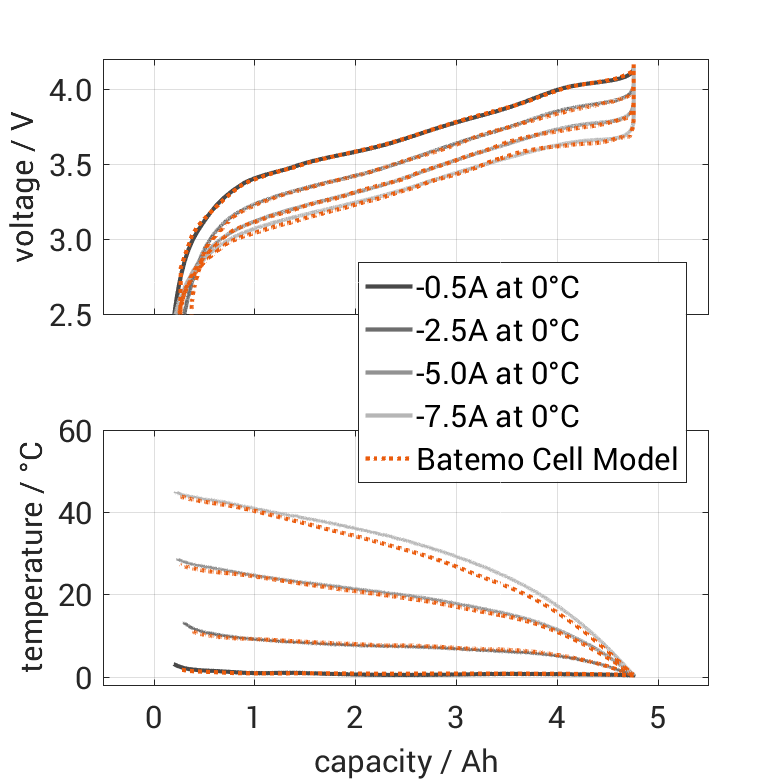 Batemo demonstrates the accuracy and validity of the Batemo Cell Model by comparing battery simulation and measurement data in the range given below. Validation is extensive, experimental characterization covers the total operational area of the cell: At low and high temperatures, up to the maximal current and in the whole state of charge range.