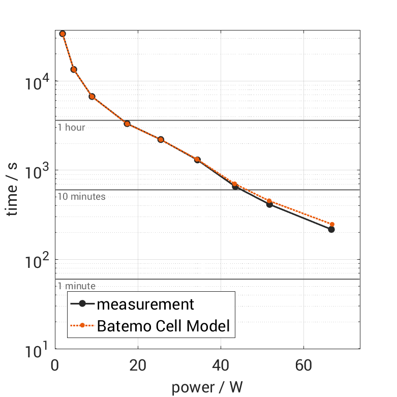 All quantities are measurement results from the Batemo battery laboratory. The continuous power is the highest power that completely discharges the cell without overheating it. Therefore, the cell is discharged from 100% state of charge (SOC) at an ambient temperature of 25°C with a constant current until a residual state of charge of 10% and either the lower voltage limit of 2.5V or 90% of the maximum surface temperature ( 63°C) is reached. The peak power is the power the cell can supply for 5 minutes. The cell is therefore discharged from 100% SOC at an ambient temperature of 25°C with a constant current until it reaches either the lower voltage limit of 2.5V or the maximum surface temperature of 70°C after 5 minutes. For cells that reach the maximum temperature limit, the measured power is directly taken as peak power. For cells that do not reach the maximum surface temperature after 5 minutes because they reach the lower voltage limit first, the measured power is multiplied by a correction factor that estimates the power that would have heated the cell to the maximum surface temperature within 5 minutes. The thermal boundary condition is free convection. These operating conditions may be outside the cell manufacturer’s specification. |
