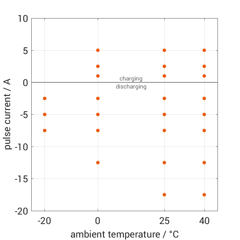 The cell is discharged from 100% SOC or charged from 0% SOC with current pulses followed by no-load phases at different ambient temperatures. The thermal boundary condition is free convection. The measurement stops when reaching either the voltage of 2.5V or 4.2V or the surface temperature of 70°C. The graph shows for which ambient temperatures and pulse currents measurements are available.