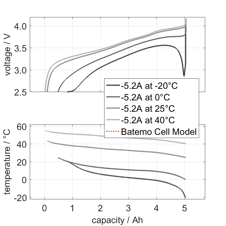 The nominal capacity originates from the manufacturer’s data sheet, if available. When the data sheet is unavailable, the nominal capacity is estimated. Batemo measured the C/10 capacity by discharging the cell at an ambient temperature of 25°C from 100% with a constant current of 0.52A (0.1C) until reaching the voltage of 2.5V. The thermal boundary condition is free convection. |