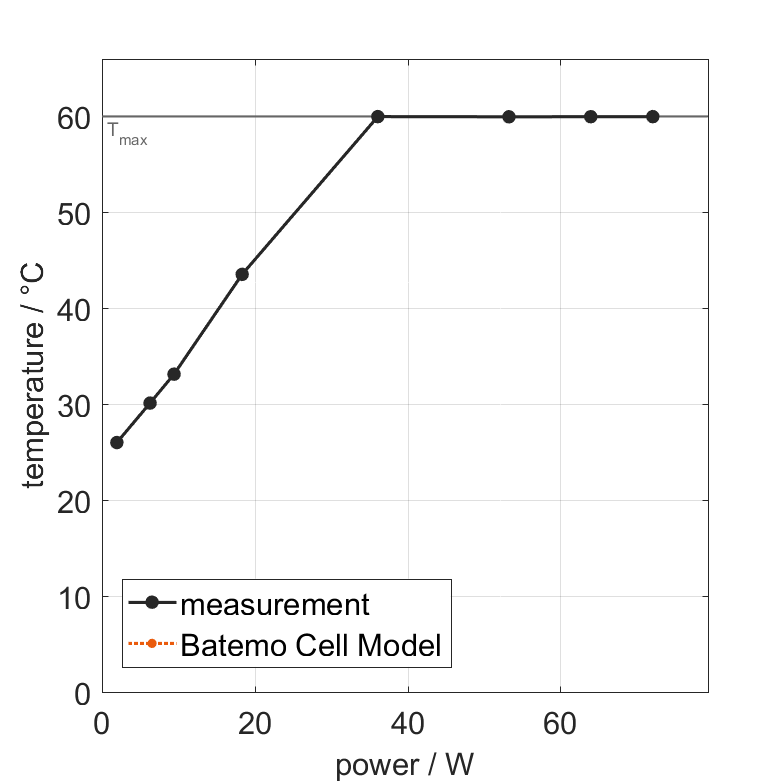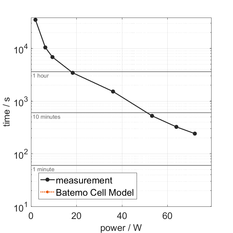 All quantities are measurement results from the Batemo battery laboratory. The continuous power is the highest power that completely discharges the cell without overheating it. Therefore, the cell is discharged from 100% state of charge (SOC) at an ambient temperature of 25°C with a constant current until a residual state of charge of 10% and either the lower voltage limit of 2.5V or 90% of the maximum surface temperature ( 54°C) is reached. The peak power is the power the cell can supply for 5 minutes. The cell is therefore discharged from 100% SOC at an ambient temperature of 25°C with a constant current until it reaches either the lower voltage limit of 2.5V or the maximum surface temperature of 60°C after 5 minutes. For cells that reach the maximum temperature limit, the measured power is directly taken as peak power. For cells that do not reach the maximum surface temperature after 5 minutes because they reach the lower voltage limit first, the measured power is multiplied by a correction factor that estimates the power that would have heated the cell to the maximum surface temperature within 5 minutes. The thermal boundary condition is free convection. These operating conditions may be outside the cell manufacturer’s specification. |
