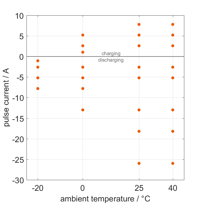 The cell is discharged from 100% SOC or charged from 0% SOC with current pulses followed by no-load phases at different ambient temperatures. The thermal boundary condition is free convection. The measurement stops when reaching either the voltage of 2.5V or 4.2V or the surface temperature of 60°C. The graph shows for which ambient temperatures and pulse currents measurements are available.