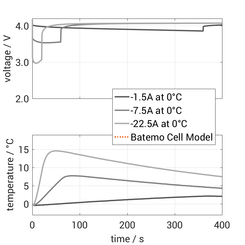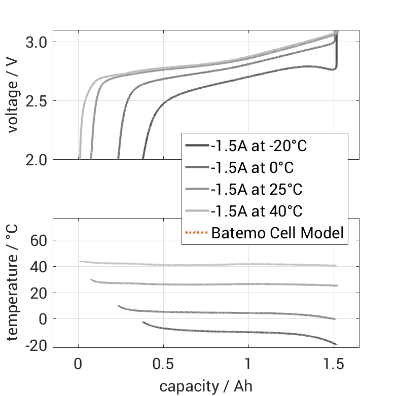 The Batemo Cell Model of the lithium-ion battery cell LG Energy Solution ICR18650HB2 is a high-precision, physical cell model with global validity. As a digital twin it seamlessly integrates into your research, development and battery analytics by basing your decisions on simulations. See the details to learn more about the features and capabilities of the Batemo Cell Model. Batemo demonstrates the accuracy and validity of the Batemo Cell Model by comparing battery simulation and measurement data in the range given below. Validation is extensive, experimental characterization covers the total operational area of the cell: At low and high temperatures, up to the maximal current and in the whole state of charge range.