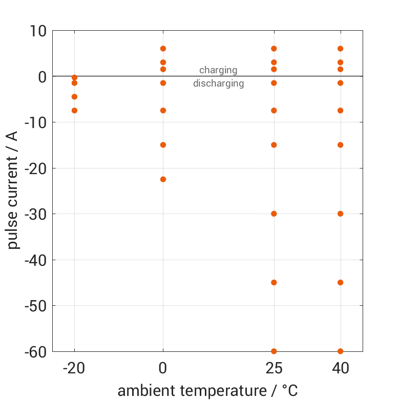 The cell is discharged from 100% SOC or charged from 0% SOC with current pulses followed by no-load phases at different ambient temperatures. The thermal boundary condition is free convection. The measurement stops when reaching either the voltage of 2.0V or 4.2V or the surface temperature of 75°C. The graph shows for which ambient temperatures and pulse currents measurements are available.