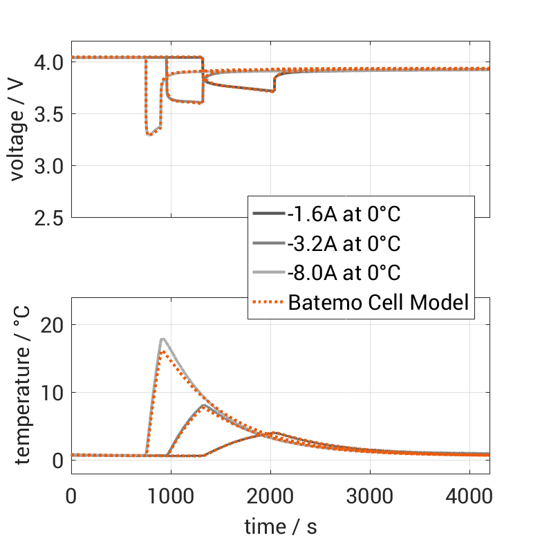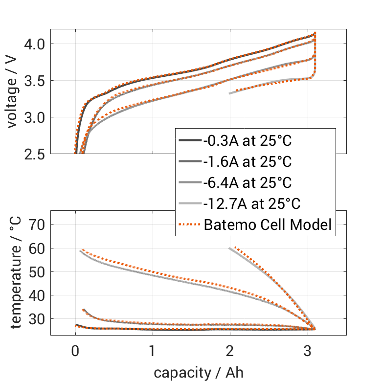 Batemo demonstrates the accuracy and validity of the Batemo Cell Model by comparing battery simulation and measurement data in the range given below. Validation is extensive, experimental characterization covers the total operational area of the cell: At low and high temperatures, up to the maximal current and in the whole state of charge range.
