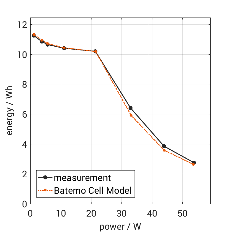 Moreover, the validation of the Batemo Cell Model is fully transparent. The Batemo Cell Data contains the raw measurement and simulation data. For all experiments the voltage, temperature, power and energy accuracies are calculated. This allows straight-forward evaluation and analysis of the Batemo Cell Model validity. The graphs show a selection of characteristic data of the cell Linkdata LD18650-3000 to evaluate the cell performance.