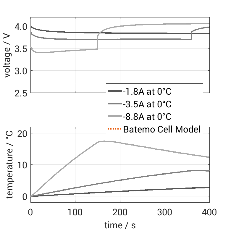 Moreover, the Batemo Cell Model valida­tion will be fully trans­parent. The Batemo Cell Data contains the raw measure­ment and simula­tion data. For all exper­i­ments the voltage, temper­a­ture, power and energy accura­cies are calcu­lated. This allows straight-forward evalu­a­tion and analysis of the Batemo Cell Model validity. The graphs show a selec­tion of charac­ter­istic data of the cell Lishen LR1865HC to evaluate the cell perfor­mance. The predic­tion of the Batemo Cell Model is included as soon as the Batemo Cell Model is finished.
