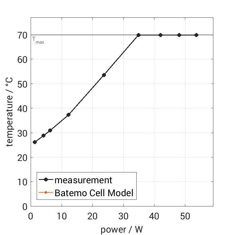 The cell is discharged from 100% SOC with different constant currents at 25°C. The thermal boundary condi­tion is free convec­tion. The measure­ment stops when reaching either the voltage of 2.5V or the surface temper­a­ture of 70°C. The graph shows the cell surface temper­a­ture at the end and the derived average power of the experiment.