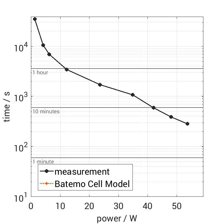 The cell is discharged from 100% SOC with different constant currents at 25°C. The thermal boundary condi­tion is free convec­tion. The measure­ment stops when reaching either the voltage of 2.5V or the surface temper­a­ture of 70°C. The graph shows the derived exper­i­ment duration and average power of the experiment.