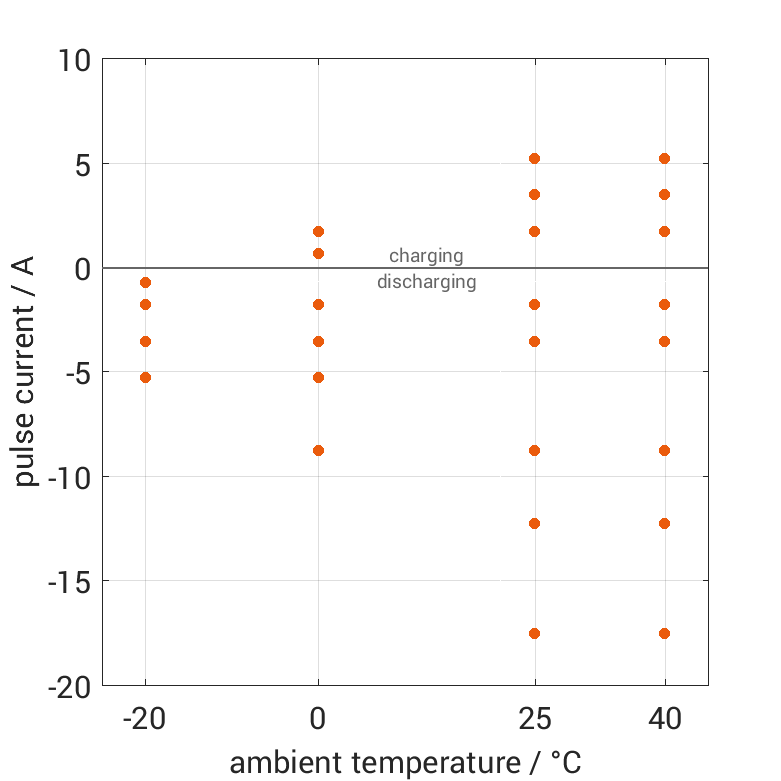 The cell is discharged from 100% SOC or charged from 0% SOC with current pulses followed by no-load phases at different ambient temper­a­tures. The thermal boundary condi­tion is free convec­tion. The measure­ment stops when reaching either the voltage of 2.5V or 4.2V or the surface temper­a­ture of 70°C. The graph shows for which ambient temper­a­tures and pulse currents measure­ments are available.