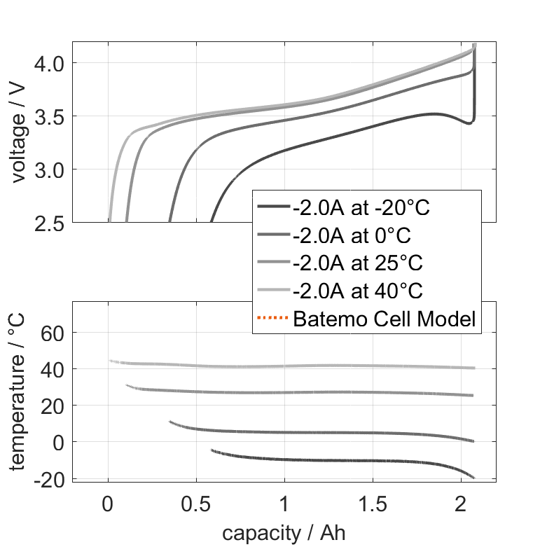 The nominal capacity originates from the manufacturer’s data sheet, if available. When the data sheet is unavailable, the nominal capacity is estimated. Batemo measured the C/10 capacity by discharging the cell at an ambient temperature of 25°C from 100% with a constant current of 0.20A (0.1C) until reaching the voltage of 2.5V. The thermal boundary condition is free convection. |