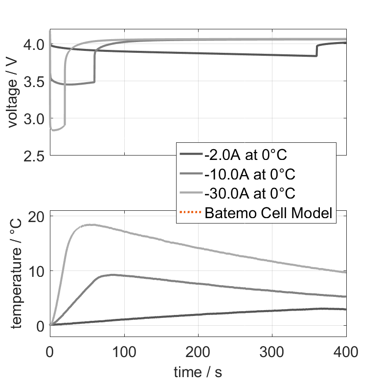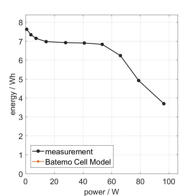 Moreover, the Batemo Cell Model validation will be fully transparent. The Batemo Cell Data contains the raw measurement and simulation data. For all experiments the voltage, temperature, power and energy accuracies are calculated. This allows straight-forward evaluation and analysis of the Batemo Cell Model validity. The graphs show a selection of characteristic data of the cell Lishen LR1865LA to evaluate the cell performance. The prediction of the Batemo Cell Model is included as soon as the Batemo Cell Model is finished.