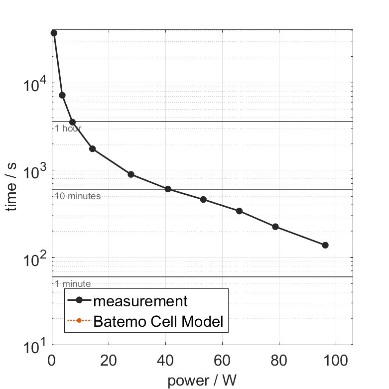 All quantities are measurement results from the Batemo battery laboratory. The continuous current is the highest current that completely discharges the cell without overheating it. Therefore, the cell is discharged from 100% state of charge (SOC) at an ambient temperature of 25°C with a constant current until a residual state of charge of 10% and either the lower voltage limit of 2.5V or 90% of the maximum surface temperature (68°C) is reached. The peak current is the current that the cell can supply for 5 minutes. The cell is therefore discharged from 100% SOC at an ambient temperature of 25°C with a constant current until it reaches either the lower voltage limit of 2.5V or the maximum surface temperature of 75°C after 5 minutes. For cells that reach the maximum surface temperature, the measured current is taken directly as the peak current. For cells that do not reach the maximum surface temperature after 5 minutes because they reach the lower voltage limit first, the measured current is multiplied by a correction factor that estimates the current that would have heated the cell to the maximum surface temperature within 5 minutes. The thermal boundary condition is free convection. These operating conditions may be outside the cell manufacturer’s specification. |