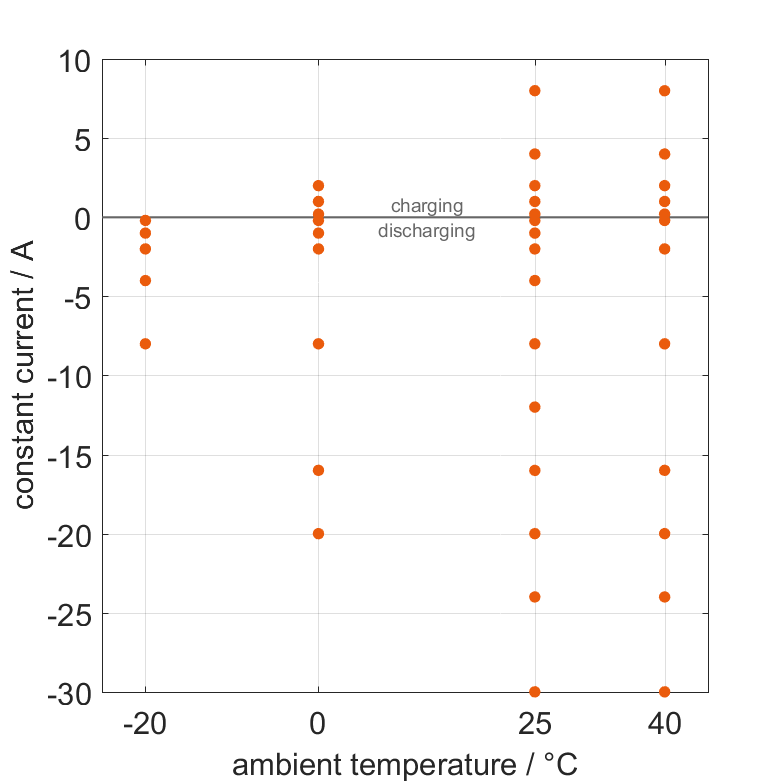 The cell is discharged from 100% SOC or charged from 0% SOC with different constant currents at different ambient temperatures. The thermal boundary condition is free convection. The measurement stops when reaching either the voltage of 2.5V or 4.2V or the surface temperature of 75°C. The graph shows for which ambient temperatures and charging and discharging constant currents measurements are available.