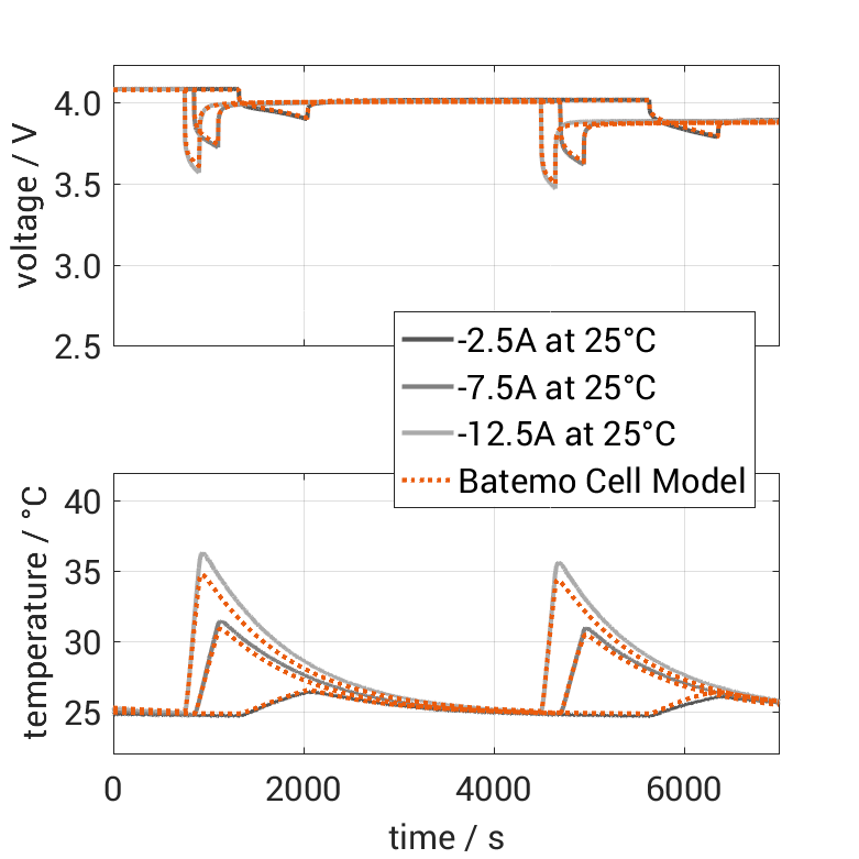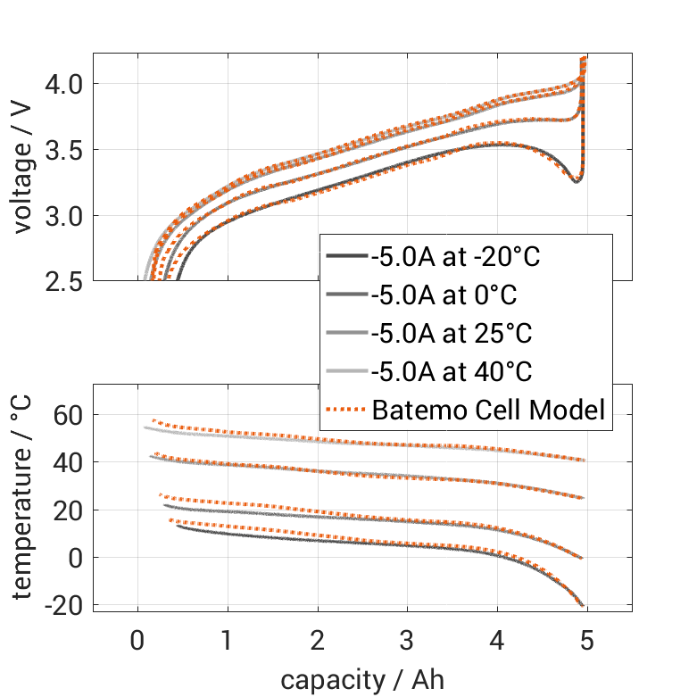 Batemo demonstrates the accuracy and validity of the Batemo Cell Model by comparing battery simulation and measurement data in the range given below. Validation is extensive, experimental characterization covers the total operational area of the cell: At low and high temperatures, up to the maximal current and in the whole state of charge range.