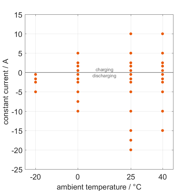The cell is discharged from 100% SOC or charged from 0% SOC with different constant currents at different ambient temper­a­tures. The thermal boundary condi­tion is free convec­tion. The measure­ment stops when reaching either the voltage of 2.5V or 4.2V or the surface temper­a­ture of 60°C. The graph shows for which ambient temper­a­tures and charging and discharging constant currents measure­ments are available.