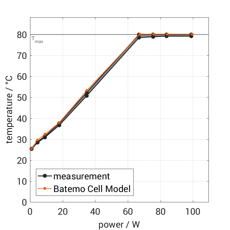 The cell is discharged from 100% SOC with different constant currents at 25°C. The thermal boundary condi­tion is free convec­tion. The measure­ment stops when reaching either the voltage of 2.5V or the surface temper­a­ture of 80°C. The graph shows the cell surface temper­a­ture at the end and the derived average power of the experiment.