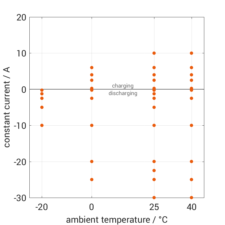 The cell is discharged from 100% SOC or charged from 0% SOC with different constant currents at different ambient temper­a­tures. The thermal boundary condi­tion is free convec­tion. The measure­ment stops when reaching either the voltage of 2.5V or 4.3V or the surface temper­a­ture of 80°C. The graph shows for which ambient temper­a­tures and charging and discharging constant currents measure­ments are available.