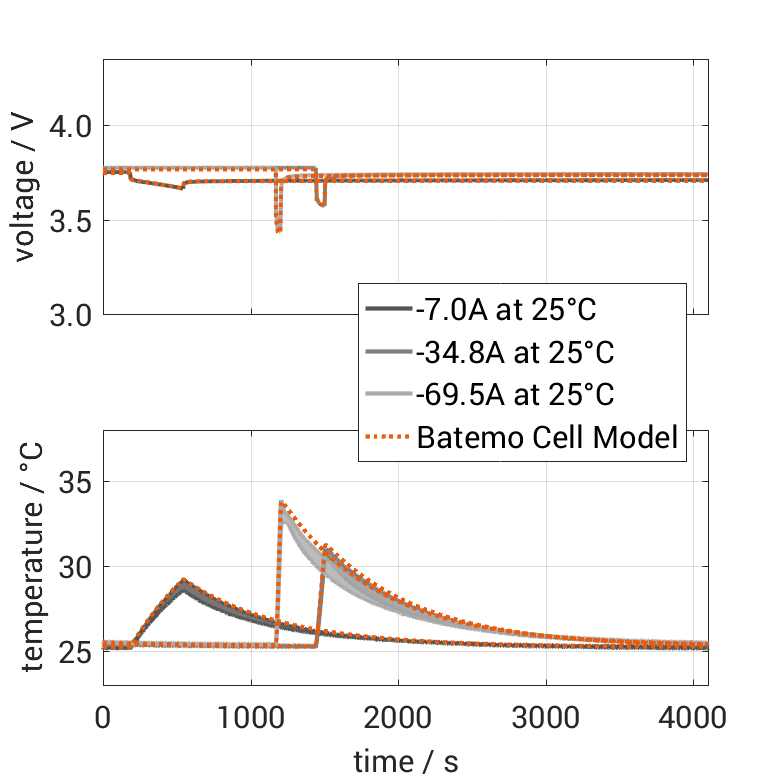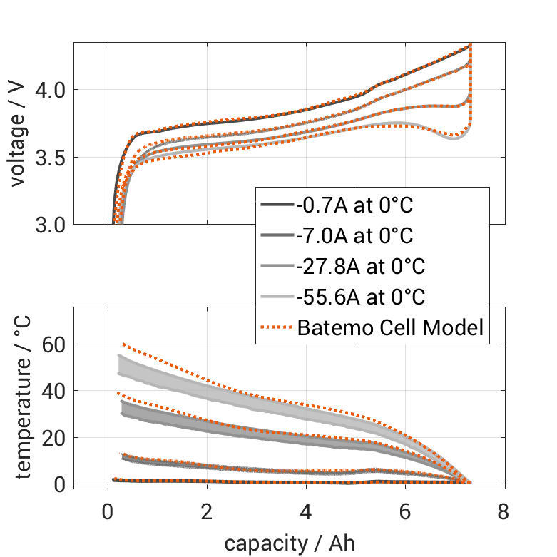 Batemo demon­strates the accuracy and validity of the Batemo Cell Model by comparing battery simula­tion and measure­ment data in the range given below. Valida­tion is exten­sive, exper­i­mental charac­ter­i­za­tion covers the total opera­tional area of the cell: At low and high temper­a­tures, up to the maximal current and in the whole state of charge range.