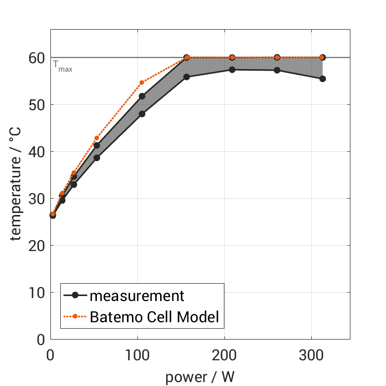 The cell is discharged from 100% SOC with different constant currents at 25°C. The thermal boundary condi­tion is free convec­tion. The measure­ment stops when reaching either the voltage of 3.0V or the surface temper­a­ture of 60°C. The graph shows the cell surface temper­a­ture at the end and the derived average power of the experiment.