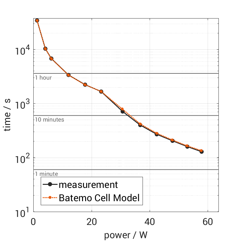 All quantities are measurement results from the Batemo battery laboratory. The continuous power is the highest power that completely discharges the cell without overheating it. Therefore, the cell is discharged from 100% state of charge (SOC) at an ambient temperature of 25°C with a constant current until a residual state of charge of 10% and either the lower voltage limit of 2.5V or 90% of the maximum surface temperature ( 54°C) is reached. The peak power is the power the cell can supply for 5 minutes. The cell is therefore discharged from 100% SOC at an ambient temperature of 25°C with a constant current until it reaches either the lower voltage limit of 2.5V or the maximum surface temperature of 60°C after 5 minutes. For cells that reach the maximum temperature limit, the measured power is directly taken as peak power. For cells that do not reach the maximum surface temperature after 5 minutes because they reach the lower voltage limit first, the measured power is multiplied by a correction factor that estimates the power that would have heated the cell to the maximum surface temperature within 5 minutes. The thermal boundary condition is free convection. These operating conditions may be outside the cell manufacturer’s specification. |