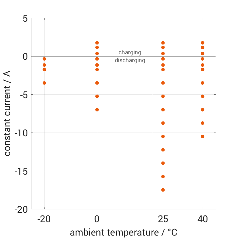 The cell is discharged from 100% SOC or charged from 0% SOC with different constant currents at different ambient temperatures. The thermal boundary condition is free convection. The measurement stops when reaching either the voltage of 2.5V or 4.2V or the surface temperature of 60°C. The graph shows for which ambient temperatures and charging and discharging constant currents measurements are available.