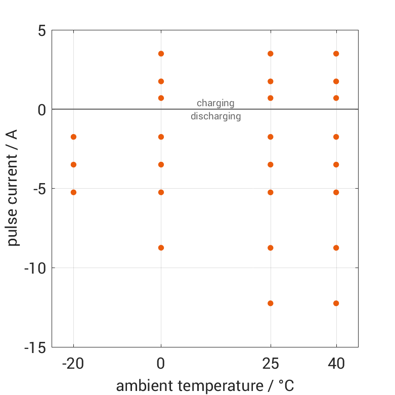 The cell is discharged from 100% SOC or charged from 0% SOC with current pulses followed by no-load phases at different ambient temperatures. The thermal boundary condition is free convection. The measurement stops when reaching either the voltage of 2.5V or 4.2V or the surface temperature of 60°C. The graph shows for which ambient temperatures and pulse currents measurements are available.
