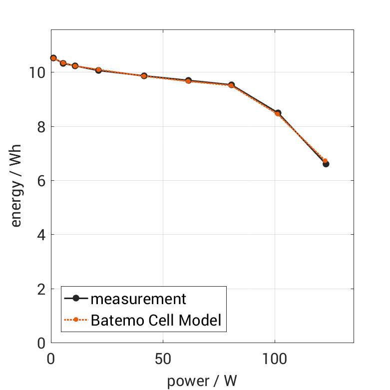 The cell is discharged from 100% SOC with different constant currents at 25°C. The thermal boundary condi­tion is free convec­tion. The measure­ment stops when reaching either the voltage of 2.5V or the surface temper­a­ture of 80°C. The graph shows the derived exchanged energy and average power of the experiment.