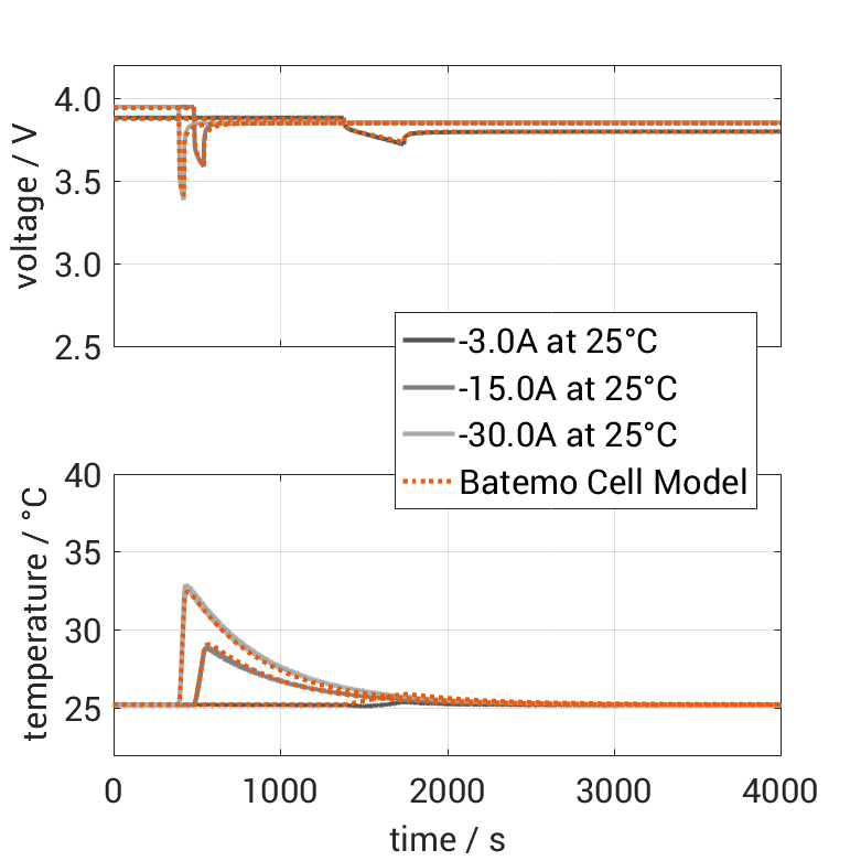 Batemo demon­strates the accuracy and validity of the Batemo Cell Model by comparing battery simula­tion and measure­ment data in the range given below. Valida­tion is exten­sive, exper­i­mental charac­ter­i­za­tion covers the total opera­tional area of the cell: At low and high temper­a­tures, up to the maximal current and in the whole state of charge range.