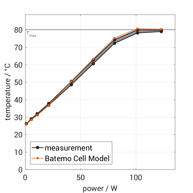 The cell is discharged from 100% SOC with different constant currents at 25°C. The thermal boundary condi­tion is free convec­tion. The measure­ment stops when reaching either the voltage of 2.5V or the surface temper­a­ture of 80°C. The graph shows the cell surface temper­a­ture at the end and the derived average power of the experiment.