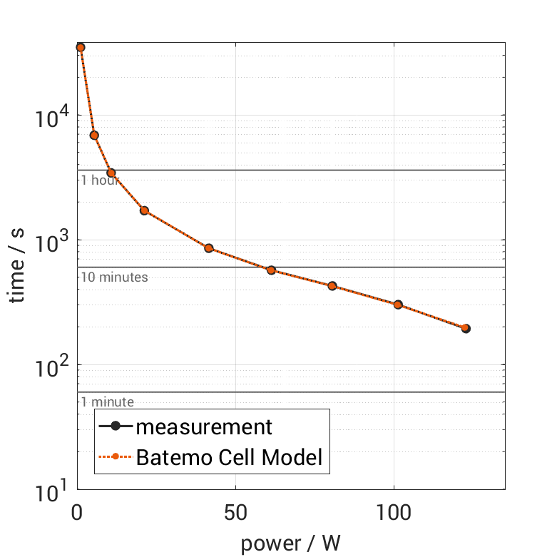 The cell is discharged from 100% SOC with different constant currents at 25°C. The thermal boundary condi­tion is free convec­tion. The measure­ment stops when reaching either the voltage of 2.5V or the surface temper­a­ture of 80°C. The graph shows the derived exper­i­ment duration and average power of the experiment.