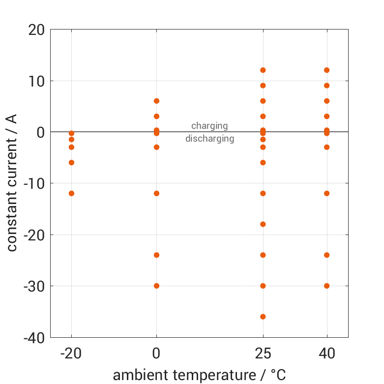 The cell is discharged from 100% SOC or charged from 0% SOC with different constant currents at different ambient temper­a­tures. The thermal boundary condi­tion is free convec­tion. The measure­ment stops when reaching either the voltage of 2.5V or 4.2V or the surface temper­a­ture of 80°C. The graph shows for which ambient temper­a­tures and charging and discharging constant currents measure­ments are available.