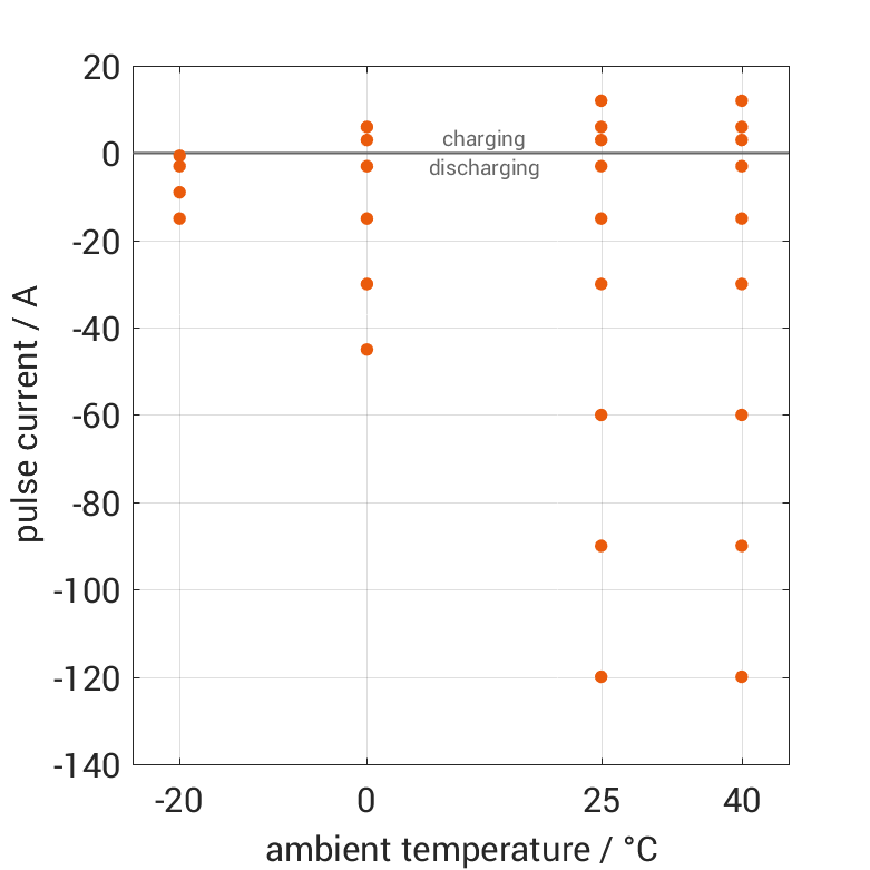 The cell is discharged from 100% SOC or charged from 0% SOC with current pulses followed by no-load phases at different ambient temper­a­tures. The thermal boundary condi­tion is free convec­tion. The measure­ment stops when reaching either the voltage of 2.5V or 4.2V or the surface temper­a­ture of 80°C. The graph shows for which ambient temper­a­tures and pulse currents measure­ments are available.