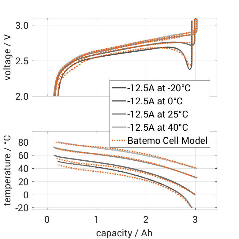 Batemo demon­strates the accuracy and validity of the Batemo Cell Model by comparing battery simula­tion and measure­ment data in the range given below. Valida­tion is exten­sive, exper­i­mental charac­ter­i­za­tion covers the total opera­tional area of the cell: At low and high temper­a­tures, up to the maximal current and in the whole state of charge range.