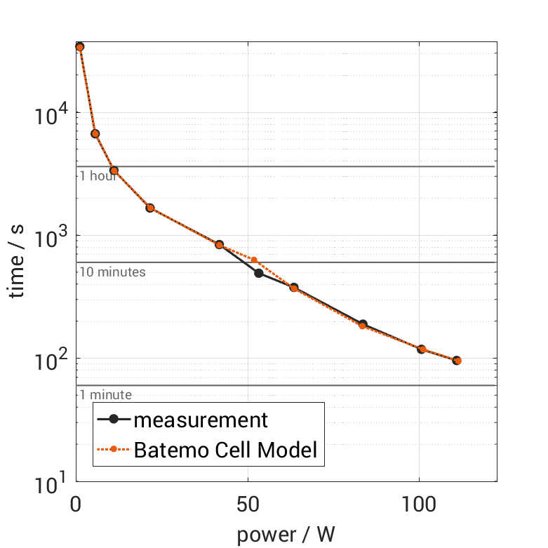 The cell is discharged from 100% SOC with different constant currents at 25°C. The thermal boundary condi­tion is free convec­tion. The measure­ment stops when reaching either the voltage of 2.0V or the surface temper­a­ture of 80°C. The graph shows the derived exper­i­ment duration and average power of the experiment.