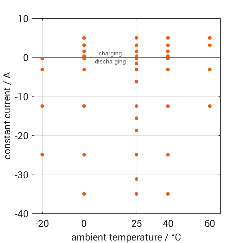 The cell is discharged from 100% SOC or charged from 0% SOC with different constant currents at different ambient temper­a­tures. The thermal boundary condi­tion is free convec­tion. The measure­ment stops when reaching either the voltage of 2.0V or 4.2V or the surface temper­a­ture of 80°C. The graph shows for which ambient temper­a­tures and charging and discharging constant currents measure­ments are available.