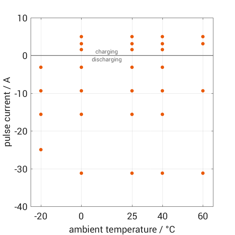 The cell is discharged from 100% SOC or charged from 0% SOC with current pulses followed by no-load phases at different ambient temper­a­tures. The thermal boundary condi­tion is free convec­tion. The measure­ment stops when reaching either the voltage of 2.0V or 4.2V or the surface temper­a­ture of 80°C. The graph shows for which ambient temper­a­tures and pulse currents measure­ments are available.