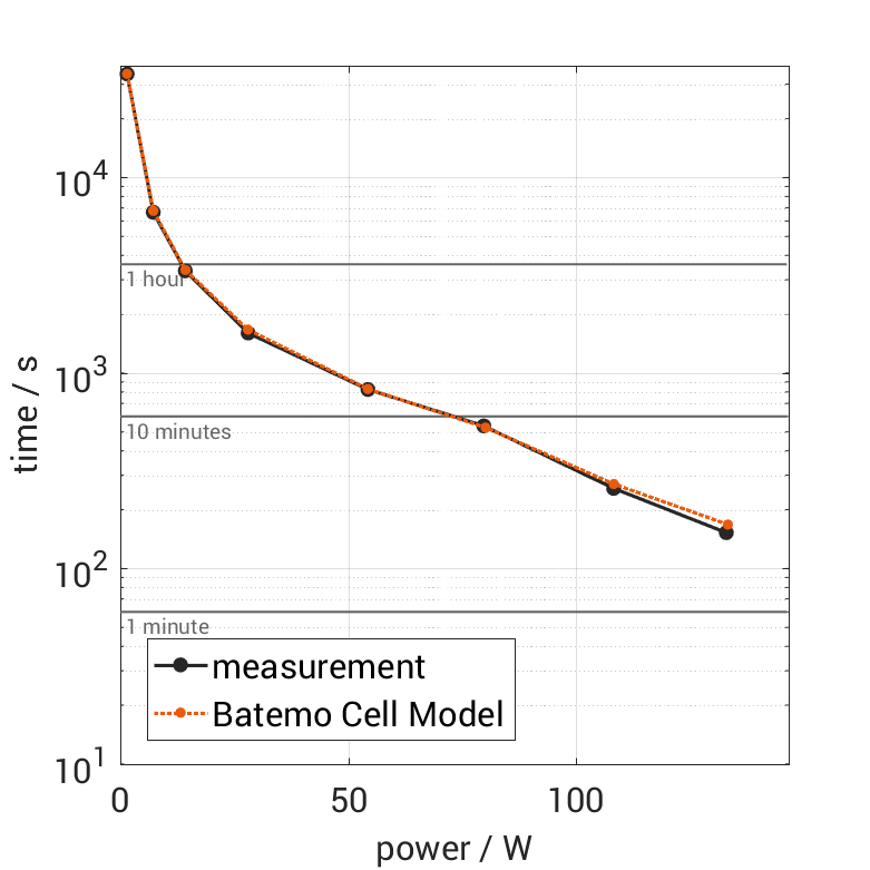 All quantities are measurement results from the Batemo battery laboratory. The continuous power is the highest power that completely discharges the cell without overheating it. Therefore, the cell is discharged from 100% state of charge (SOC) at an ambient temperature of 25°C with a constant current until a residual state of charge of 10% and either the lower voltage limit of 2.5V or 90% of the maximum surface temperature ( 72°C) is reached. The peak power is the power the cell can supply for 5 minutes. The cell is therefore discharged from 100% SOC at an ambient temperature of 25°C with a constant current until it reaches either the lower voltage limit of 2.5V or the maximum surface temperature of 80°C after 5 minutes. For cells that reach the maximum temperature limit, the measured power is directly taken as peak power. For cells that do not reach the maximum surface temperature after 5 minutes because they reach the lower voltage limit first, the measured power is multiplied by a correction factor that estimates the power that would have heated the cell to the maximum surface temperature within 5 minutes. The thermal boundary condition is free convection. These operating conditions may be outside the cell manufacturer’s specification. |