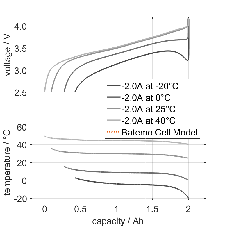 The cell is discharged from 100% SOC with different constant currents at different ambient temper­a­tures. The thermal boundary condi­tion is free convec­tion. The measure­ment stops when reaching either the voltage of 2.5V or the surface temper­a­ture of 60°C.