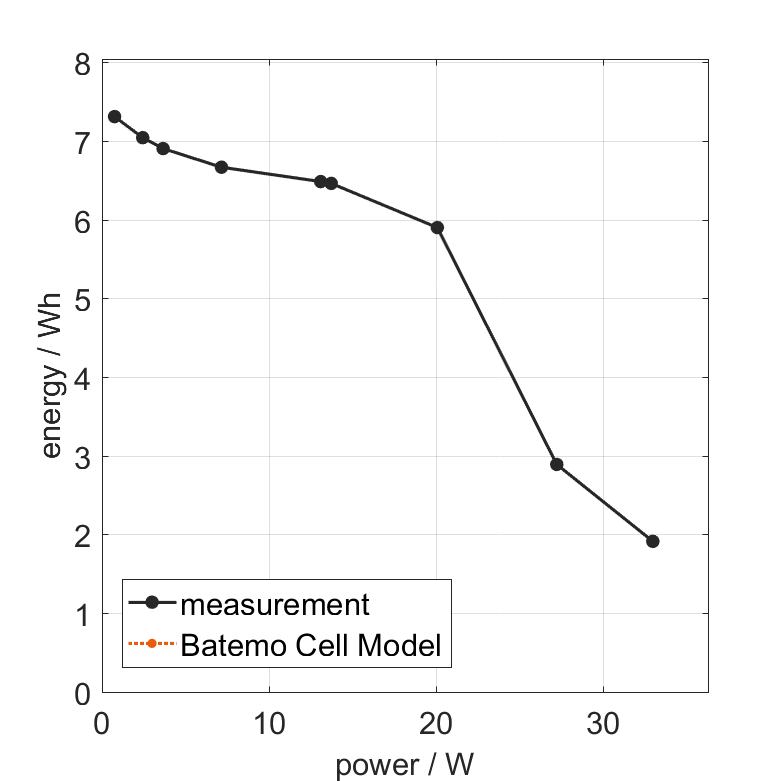 The cell is discharged from 100% SOC with different constant currents at 25°C. The thermal boundary condi­tion is free convec­tion. The measure­ment stops when reaching either the voltage of 2.5V or the surface temper­a­ture of 60°C. The graph shows the derived exchanged energy and average power of the experiment.