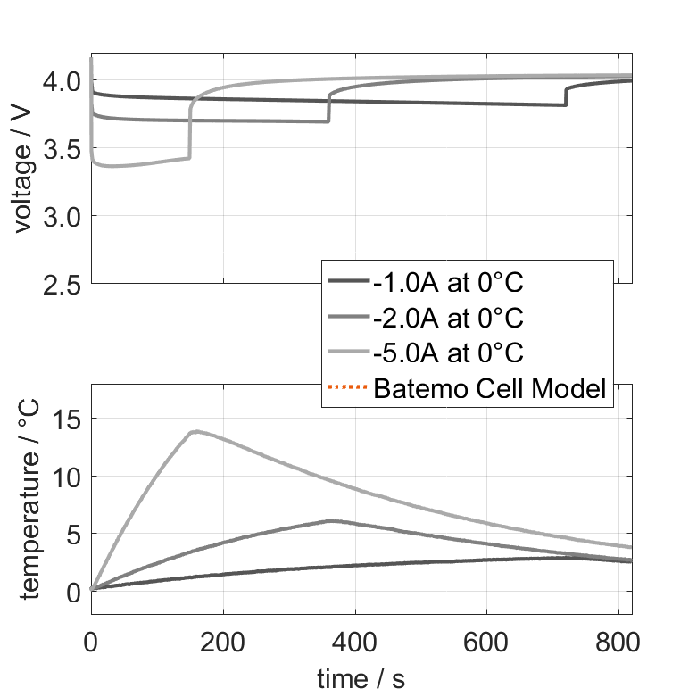 Moreover, the Batemo Cell Model valida­tion will be fully trans­parent. The Batemo Cell Data contains the raw measure­ment and simula­tion data. For all exper­i­ments the voltage, temper­a­ture, power and energy accura­cies are calcu­lated. This allows straight-forward evalu­a­tion and analysis of the Batemo Cell Model validity. The graphs show a selec­tion of charac­ter­istic data of the cell Panasonic NCR18500A to evaluate the cell perfor­mance. The predic­tion of the Batemo Cell Model is included as soon as the Batemo Cell Model is finished.
