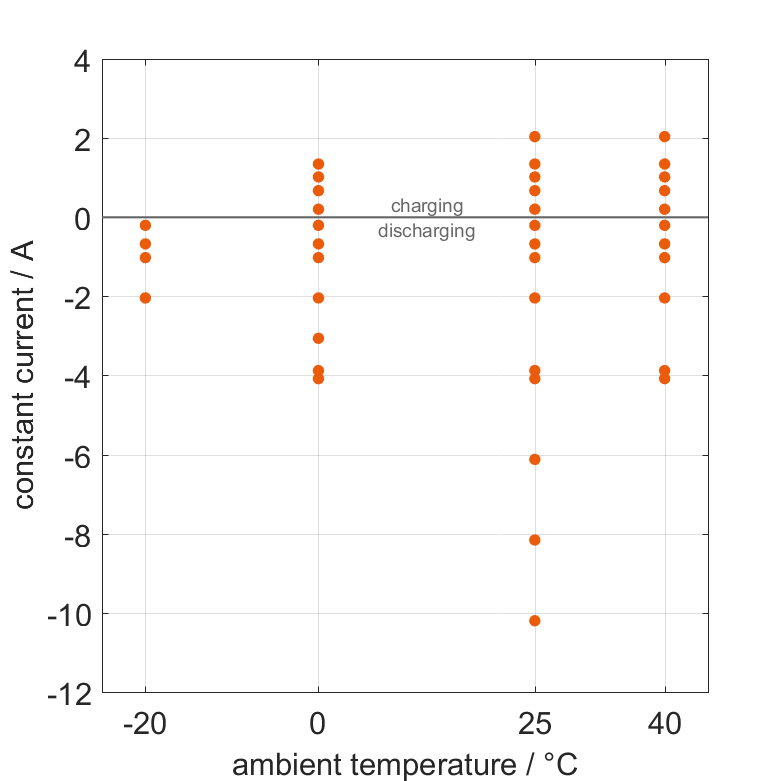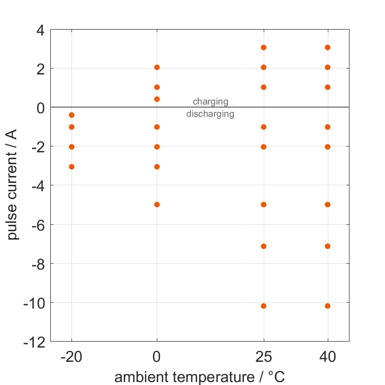 The cell is discharged from 100% SOC or charged from 0% SOC with current pulses followed by no-load phases at different ambient temper­a­tures. The thermal boundary condi­tion is free convec­tion. The measure­ment stops when reaching either the voltage of 2.5V or 4.2V or the surface temper­a­ture of 60°C. The graph shows for which ambient temper­a­tures and pulse currents measure­ments are available.
