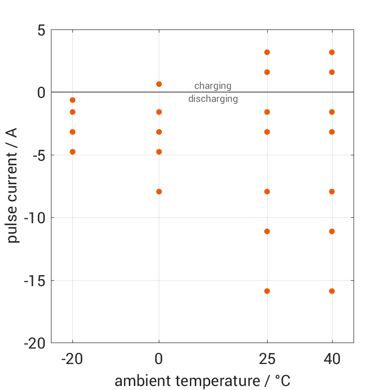 The cell is discharged from 100% SOC or charged from 0% SOC with current pulses followed by no-load phases at different ambient temperatures. The thermal boundary condition is free convection. The measurement stops when reaching either the voltage of 2.5V or 4.2V or the surface temperature of 60°C. The graph shows for which ambient temperatures and pulse currents measurements are available.