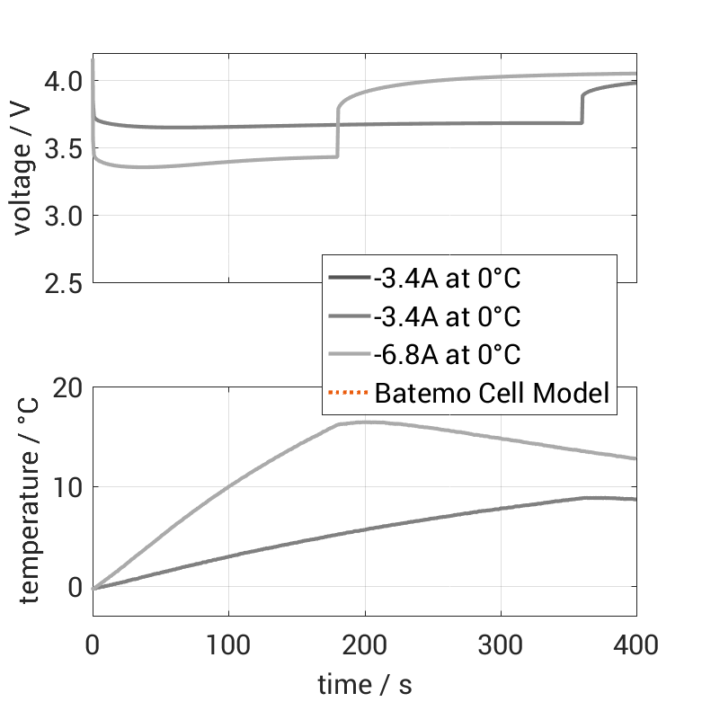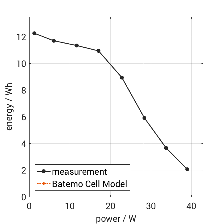 Moreover, the Batemo Cell Model validation will be fully transparent. The Batemo Cell Data contains the raw measurement and simulation data. For all experiments the voltage, temperature, power and energy accuracies are calculated. This allows straight-forward evaluation and analysis of the Batemo Cell Model validity. The graphs show a selection of characteristic data of the cell Panasonic NCR18650-G to evaluate the cell performance. The prediction of the Batemo Cell Model is included as soon as the Batemo Cell Model is finished.