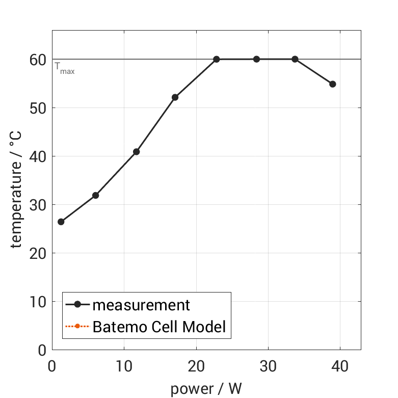 All quantities are measurement results from the Batemo battery laboratory. The continuous current is the highest current that completely discharges the cell without overheating it. Therefore, the cell is discharged from 100% state of charge (SOC) at an ambient temperature of 25°C with a constant current until a residual state of charge of 10% and either the lower voltage limit of 2.5V or 90% of the maximum surface temperature (54°C) is reached. The peak current is the current that the cell can supply for 5 minutes. The cell is therefore discharged from 100% SOC at an ambient temperature of 25°C with a constant current until it reaches either the lower voltage limit of 2.5V or the maximum surface temperature of 60°C after 5 minutes. For cells that reach the maximum surface temperature, the measured current is taken directly as the peak current. For cells that do not reach the maximum surface temperature after 5 minutes because they reach the lower voltage limit first, the measured current is multiplied by a correction factor that estimates the current that would have heated the cell to the maximum surface temperature within 5 minutes. The thermal boundary condition is free convection. These operating conditions may be outside the cell manufacturer’s specification. |