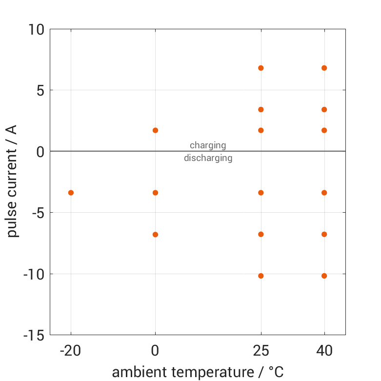 The cell is discharged from 100% SOC or charged from 0% SOC with current pulses followed by no-load phases at different ambient temperatures. The thermal boundary condition is free convection. The measurement stops when reaching either the voltage of 2.5V or 4.2V or the surface temperature of 60°C. The graph shows for which ambient temperatures and pulse currents measurements are available.