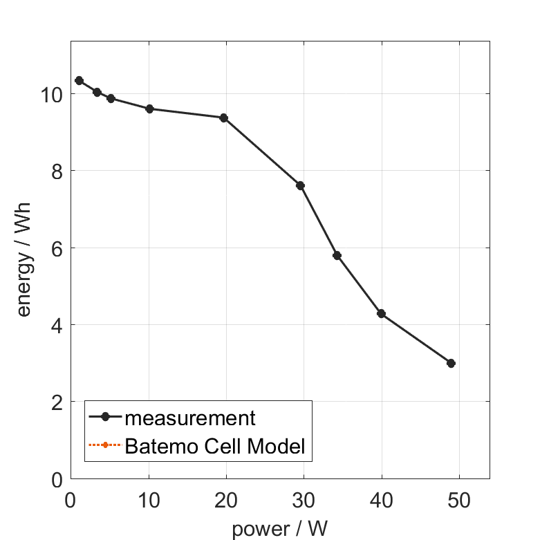 The cell is discharged from 100% SOC with different constant currents at 25°C. The thermal boundary condi­tion is free convec­tion. The measure­ment stops when reaching either the voltage of 2.5V or the surface temper­a­ture of 60°C. The graph shows the derived exchanged energy and average power of the experiment.