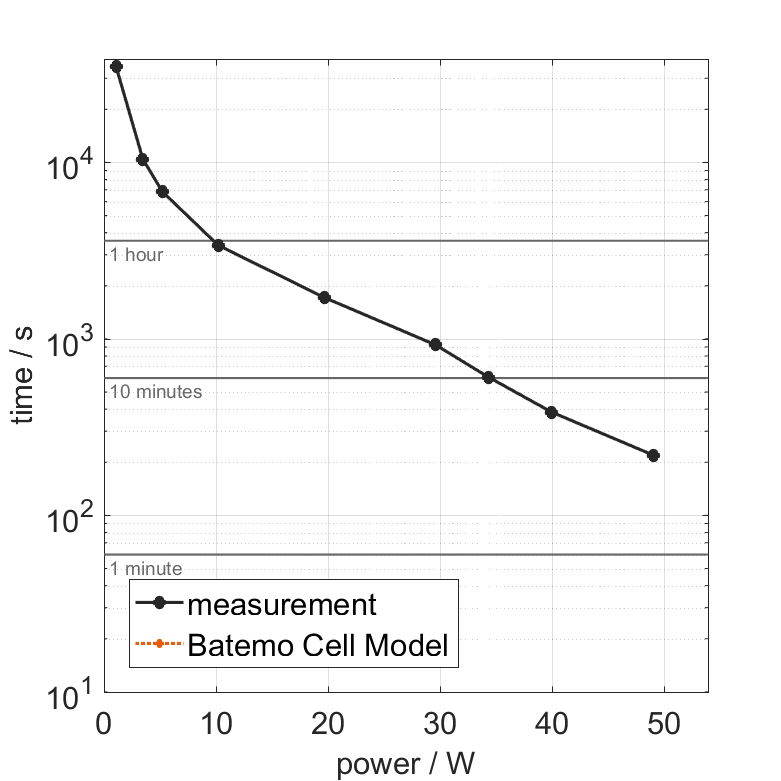 The cell is discharged from 100% SOC with different constant currents at 25°C. The thermal boundary condi­tion is free convec­tion. The measure­ment stops when reaching either the voltage of 2.5V or the surface temper­a­ture of 60°C. The graph shows the derived exper­i­ment duration and average power of the experiment.