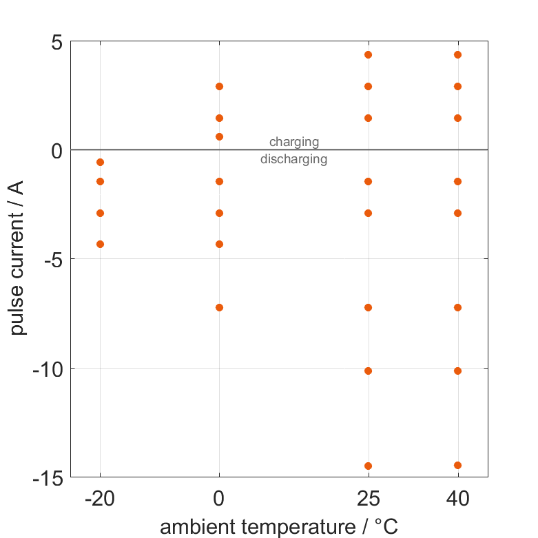 The cell is discharged from 100% SOC or charged from 0% SOC with current pulses followed by no-load phases at different ambient temper­a­tures. The thermal boundary condi­tion is free convec­tion. The measure­ment stops when reaching either the voltage of 2.5V or 4.2V or the surface temper­a­ture of 60°C. The graph shows for which ambient temper­a­tures and pulse currents measure­ments are available.
